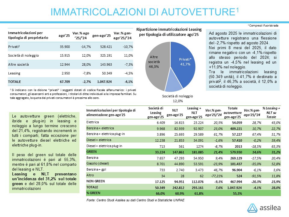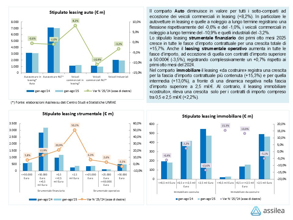 Nei primi 8 mesi dell'anno sono stati registrati 498.643 nuovi contratti di leasing, per un valore di oltre 22,8 mld. di €, con una crescita del +2,6% in valore e una sostanziale stabilità in numero.