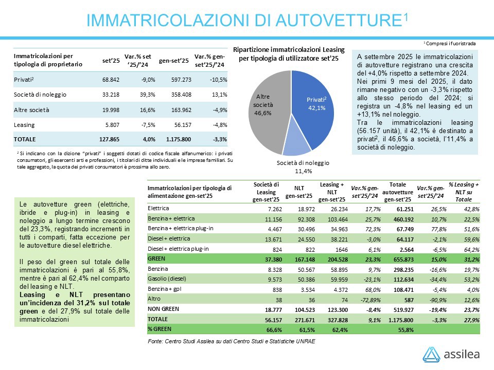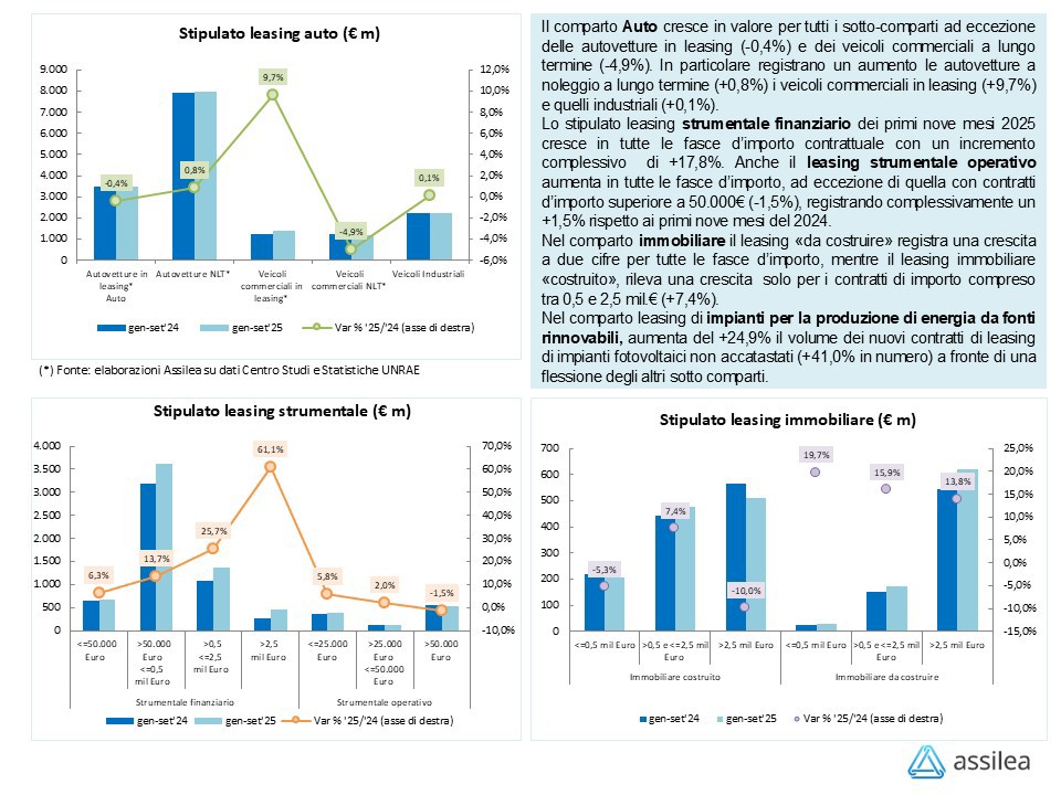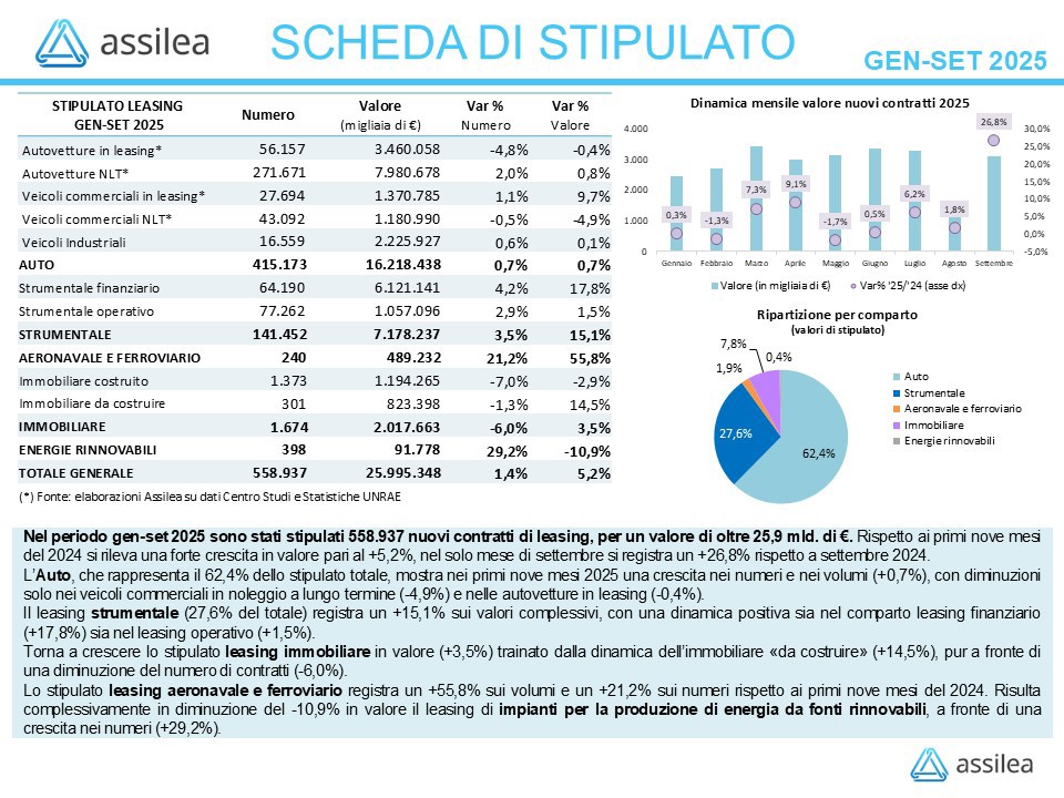Il Centro Studi e Statistiche Assilea ha diffuso l’analisi dello stipulato leasing relativo al periodo gennaio-settembre 2025, in cui sono stati registrati 558.937 nuovi contratti di leasing, per un valore di quasi 26 miliardi di euro (+5,2%).